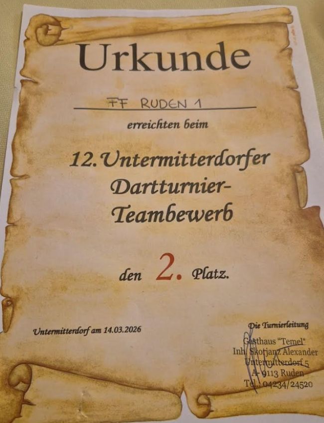 Am 14.3.2026 fand ein Dartturnier beim Gasthaus Temel in Untermitterdorf statt. Hieran teilzunehmen lies sich eine kleine Gruppe der FF Ruden nicht nehmen.